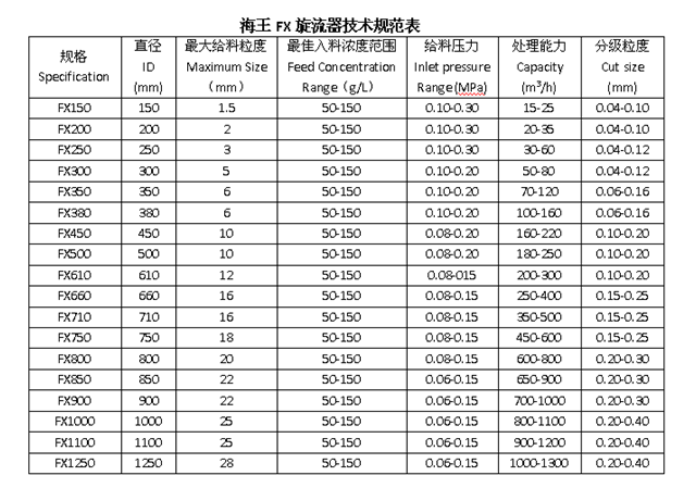 海王公司用于煤礦煤泥水分級(jí)、濃縮、脫水、脫泥的旋流器FX系列,規(guī)格從Ф150-Ф1250(mm), 分離粒度從4μm-400μm。